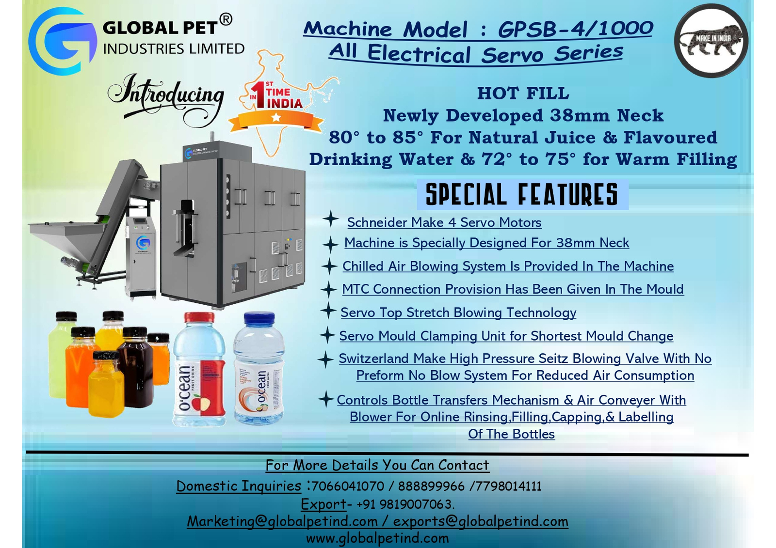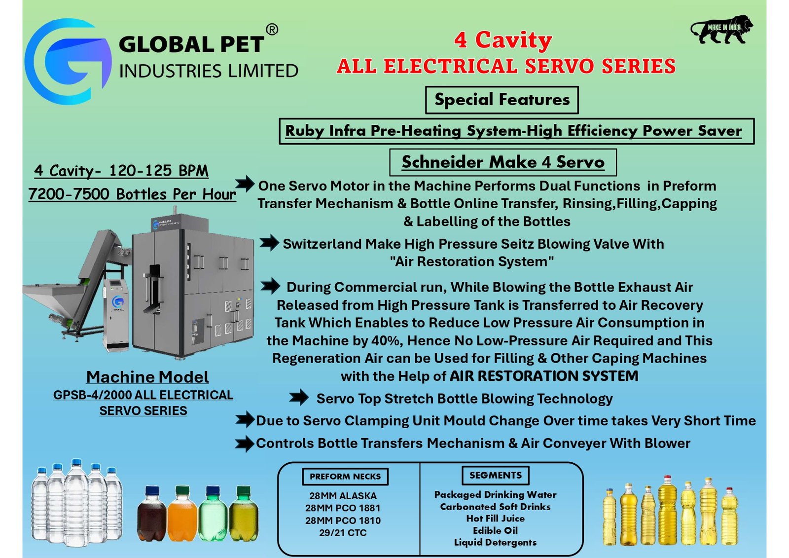 The All-Electrical 4 Cavity – 4 Servo Series – 120 BPM is a next-generation PET blowing solution designed for ultra-high speed, precision, and operational excellence. Equipped with advanced TOP blowing technology, it offers full servo control on clamping, stretching, indexing, and transfer systems. This 4-cavity model delivers up to 7,200 Bottles Per Hour (BPH) with exceptional consistency, low maintenance, and high energy efficiency — making it the ideal solution for demanding production environments in water, beverages, edible oils, and more.