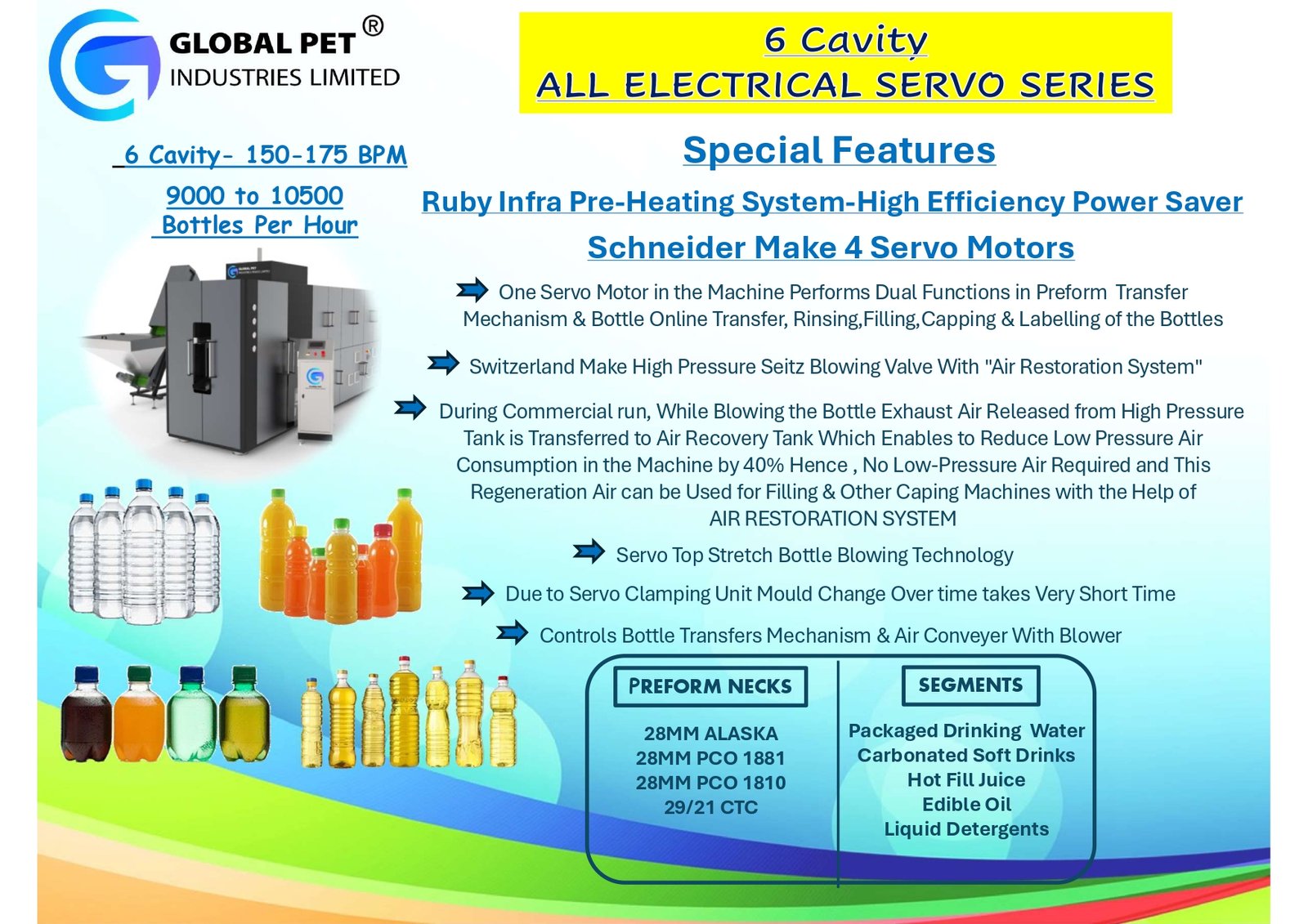 The official catalog for our premium All-Electrical Servo Series PET Blowing Machines provides comprehensive specifications for 2-cavity, 4-cavity, and 6-cavity models, with output capacities ranging from 60 to 175 Bottles Per Minute (BPM). It includes detailed information on power, air, and utility requirements, along with machine layout diagrams and available upgrade options.