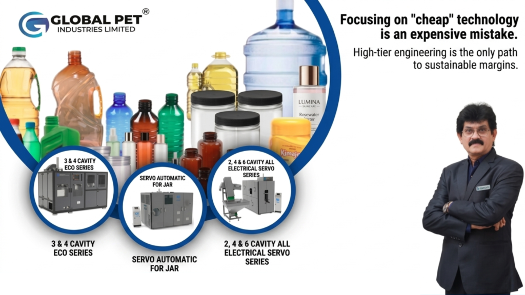 Focusing on “cheap” technology is an expensive mistake. High – tier engineering is the only path to sustainable margins. Fiscal Strategic Briefing Uncovering the systemic operational inefficiencies that erode profitability in the PET packaging ecosystem. In the competitive landscape of industrial manufacturing, focusing solely on the acquisition cost of machinery is a strategic oversight. True profitability is defined by the Total Cost of Ownership (TCO). At Global Pet Industries Limited, leveraging our 30-year engineering pedigree, we have identified the primary “Hidden Opex” vectors that silently degrade the financial health of manufacturing enterprises. Exposure Vector 01 Systemic Power Inefficiency Low-tier heating systems lack thermal regulation, leading to excessive energy draw. Over a 5-year cycle, the electricity cost delta between a standard and an energy-efficient machine can exceed the initial purchase price. Exposure Vector 02 Material Attrition & Rejection Inconsistent thermal profiles result in high rejection rates. Every failed unit represents wasted resin, lost production time, and a direct reduction in net yield. Exposure Vector 03 Operational Stagnation (Downtime) Unplanned breakdowns are not merely repair costs; they are “Opportunity Costs” that damage client trust and disrupt global supply chain commitments. Exposure Vector 04 Manual Labor Liability High dependency on manual intervention increases payroll overhead and the statistical probability of human error, preventing the precision required for pharma-grade output. Exposure Vector 05 Mould Life Degradation Substandard mould metallurgy leads to uneven thickness and premature wear, forcing frequent, unplanned capital reinvestment. Exposure Vector 06 Technical Support Vacuum A lack of rapid, expert-level technical response turns minor mechanical issues into catastrophic production halts. “Profit is not determined by the price of entry, but by the efficiency of the lifecycle.” Focusing on “cheap” technology is an expensive mistake. High-tier engineering is the only path to sustainable margins. The Architecture of Profitability Advanced Servo-Driven Production Lines High-Efficiency Infrared Heating Modules Precision-Engineered Multi-Cavity Moulds Scalable, Automated Manufacturing Workflows 24/7 Technical Consultation Ecosystem NSE-Listed Transparency & Reliability Mr. Bipin Nanubhai Panchal Promoter Chairman and Managing Director Global Pet Industries Limited 30 YEARS OF ENGINEERING EXCELLENCE | NSE SME LISTED ENTITY