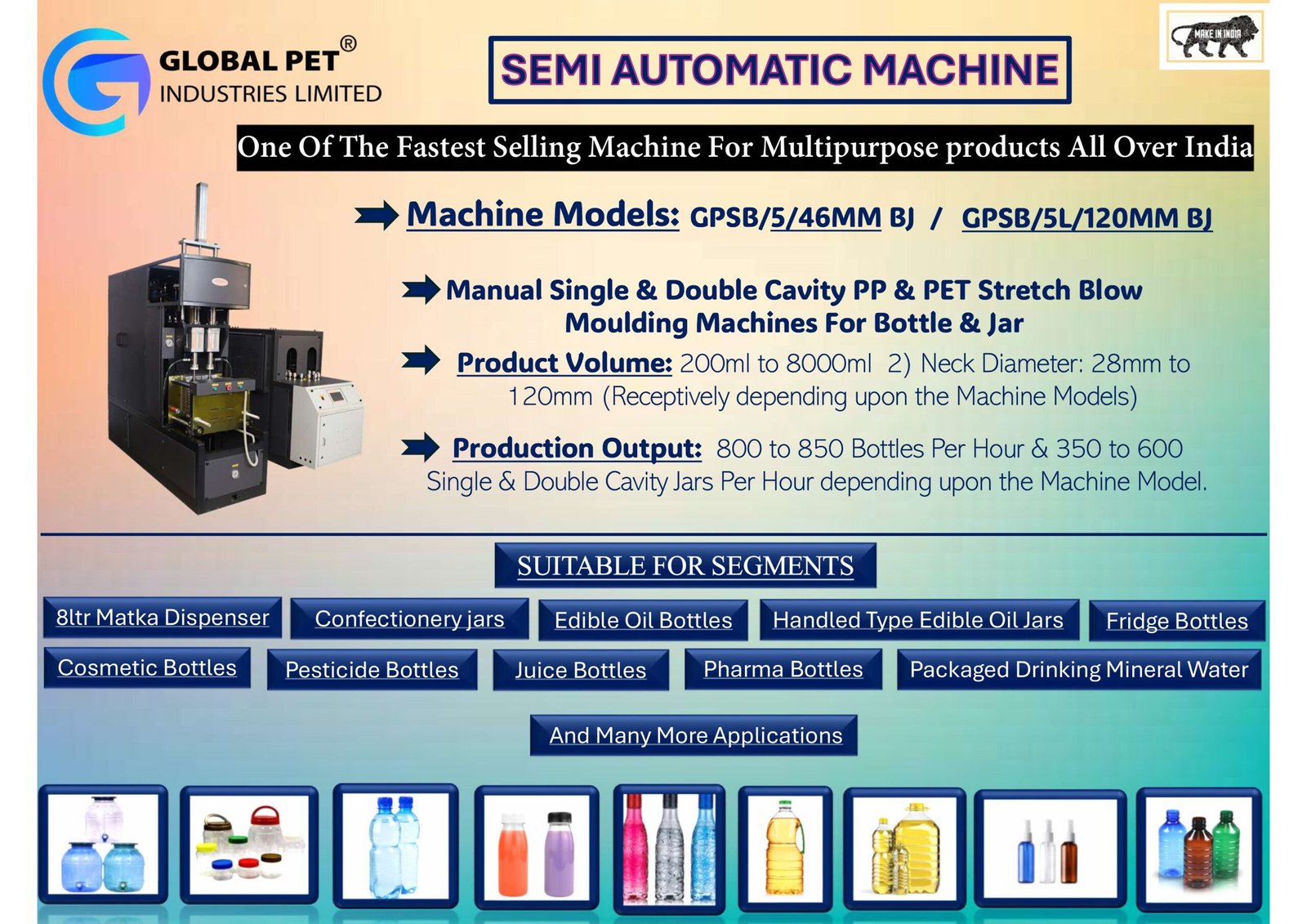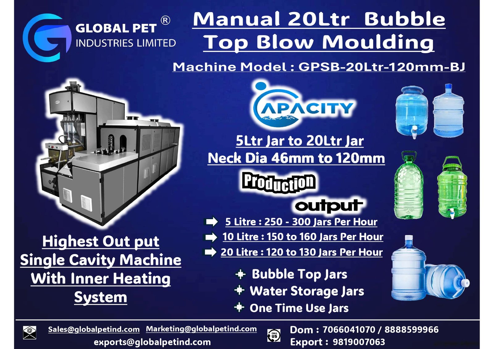 | GPSB-20LTR | 1 Cavity | 5L – 20L | 100–150 BPH | 46mm / 120mm | Manual Heating | Low (Manual Heater) | 30 Bar | 2–3 TR |
